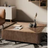 Mặt bàn được chia khối hình học độc đáo với các tone gỗ nâu nhạt – nâu trầm phối hợp hài hòa, tạo chiều sâu thị giác và điểm nhấn sang trọng. Đây chính là mẫu bàn trà không chỉ phục vụ chức năng mà còn là món đồ nội thất trang trí đầy thẩm mỹ.