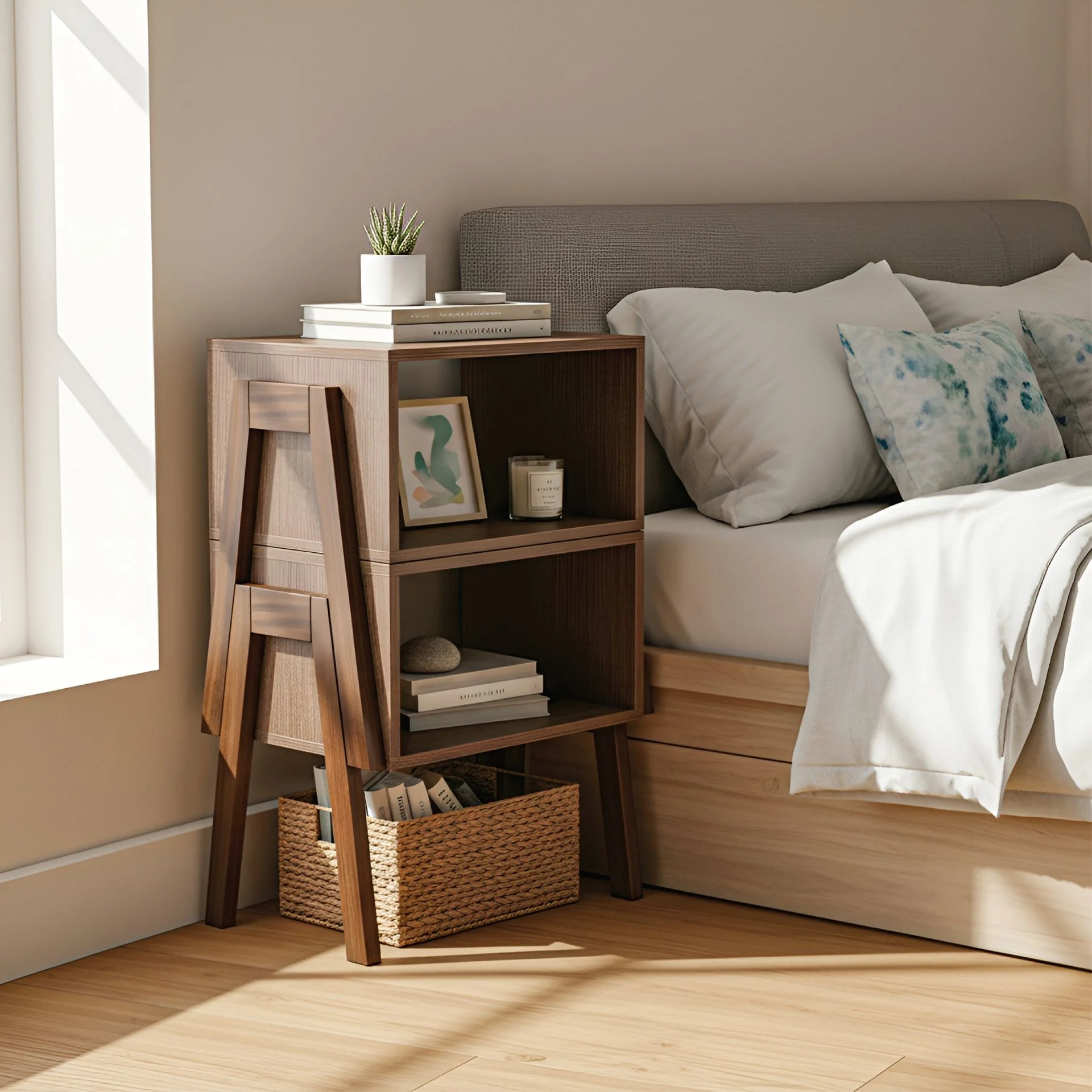 - Kiểu dáng: Có thể chồng tầng linh hoạt để tiết kiệm diện tích hoặc làm kệ đầu giường
