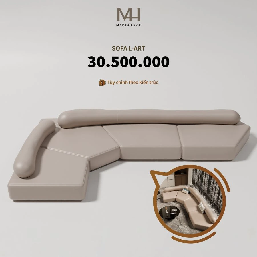 Sofa L-Art là mẫu sofa góc da cao cấp mang phong cách hiện đại đậm chất nghệ thuật, được thiết kế và hoàn thiện bởi thương hiệu Made4Home Việt Nam. Với hình khối phá cách cùng màu be sang trọng, L-Art không chỉ là một chiếc ghế sofa, mà còn là một tác phẩm nghệ thuật giúp nâng tầm không gian sống.